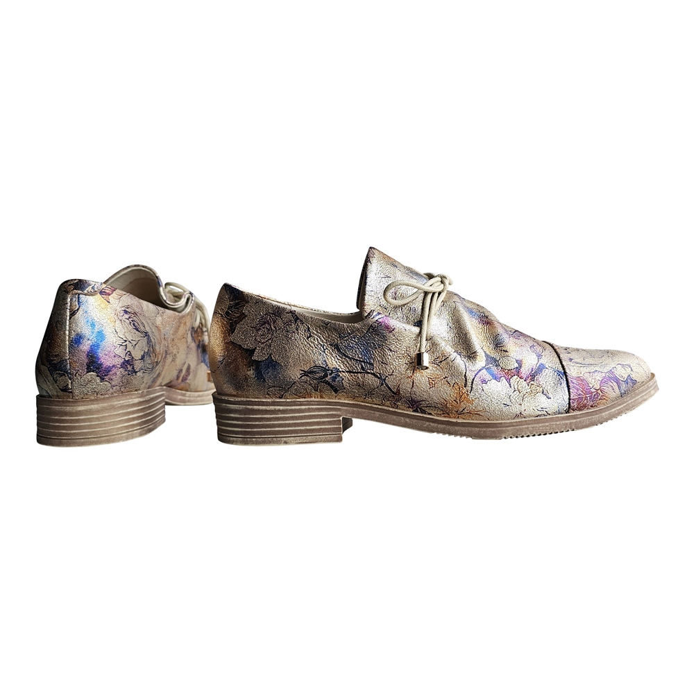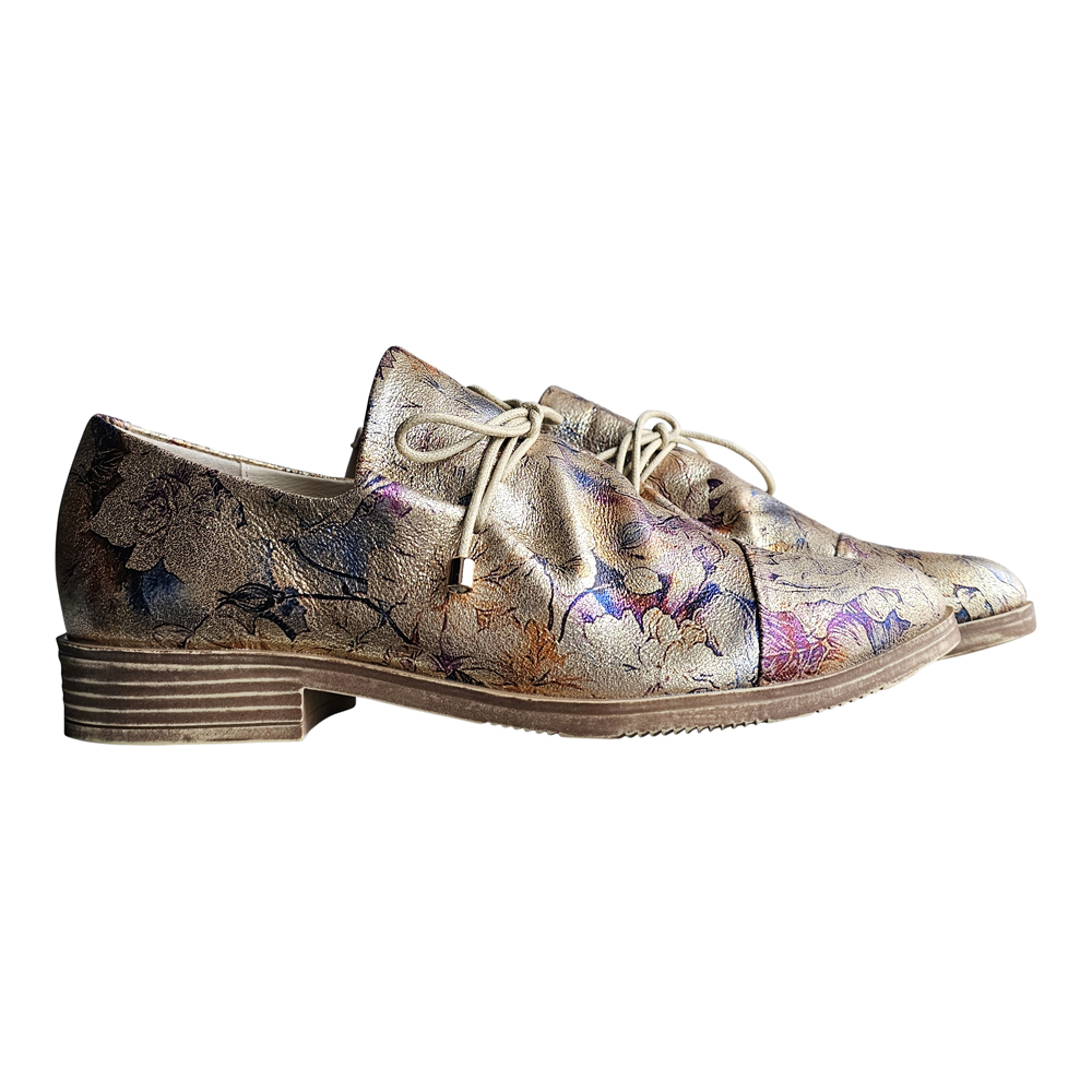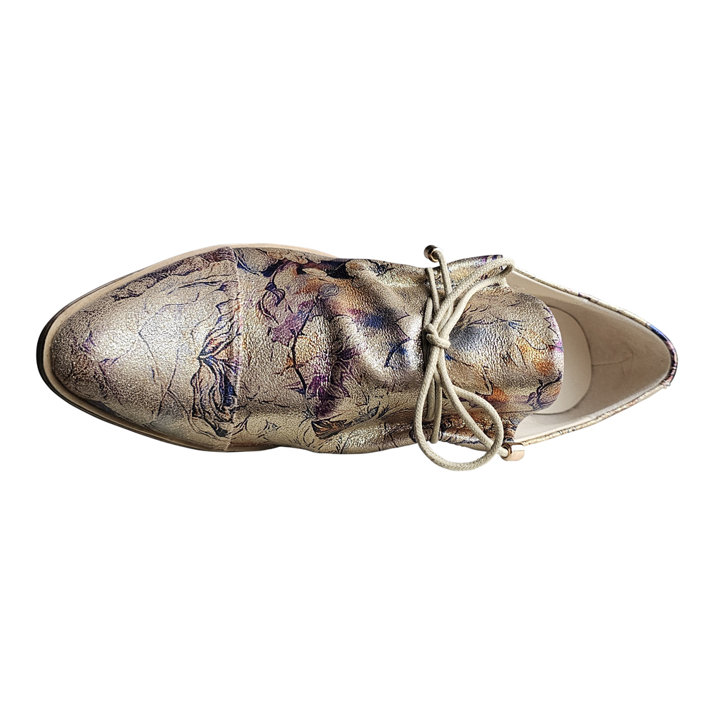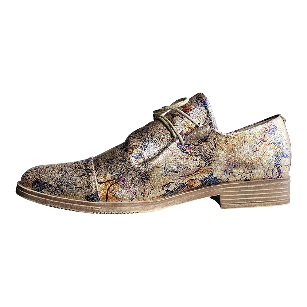 Sized in European, Kotty fits true to size in the length.  Even though the toe is somewhat pointed, there is nothing narrow about this shoe  The upper has a tie that allows for a somewhat custom fit in the instep.  They are best suited for an average to above-average width foot.